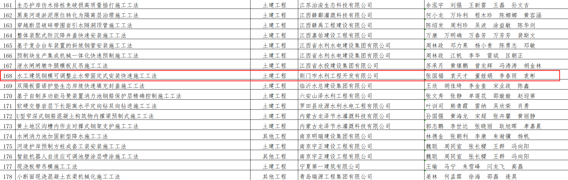 近日,中國(guó)水利工程協(xié)會(huì)公布了2025年度水利行業(yè)工法名單,荊門市城市水務(wù)集團(tuán)有限公司下屬單位荊門市水利工程開發(fā)有限公司(以下簡(jiǎn)稱“荊門水發(fā)”)申報(bào)的“水工建筑鋼??烧{(diào)整止水帶固定式安裝快速施工工法”順利通過評(píng)審,正式被確認(rèn)為中國(guó)水利行業(yè)工法,為水利工程標(biāo)準(zhǔn)化、高效化建設(shè)提供了有力支撐。