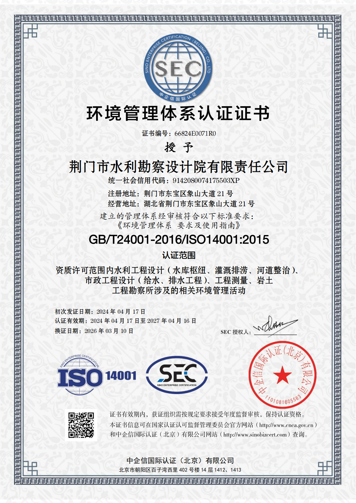 近日,市水務(wù)集團下屬子公司荊門市水利勘察設(shè)計院有限責任公司(以下簡稱“水勘院”)順利通過QES(質(zhì)量、環(huán)境及職業(yè)健康安全)三體系再認證審核,并新增市政工程設(shè)計(給水、排水工程)認證范圍,這標志著水勘院從水利工程向市政水務(wù)工程領(lǐng)域邁出了實質(zhì)性的一步。